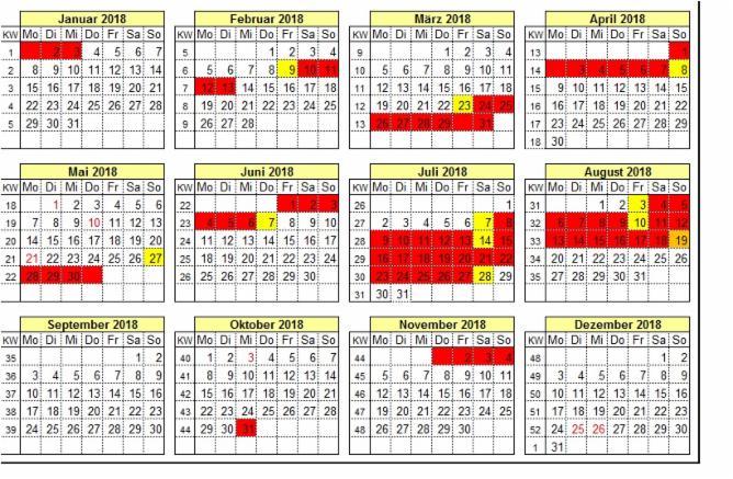 | Land | Winterferien 2018 | Osterferien 2018 | Himmelfahrt 2018 | Pfingstferien 2018 | Sommerferien 2018 | Herbstferien 2018 | Weihnachtsferien 2018/2019 |